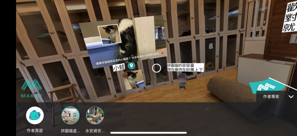 「VR線上虛擬貓屋」是由孩子們學習製作VR虛擬實境程式之後,自行採訪拼圖喵,撰稿剪輯配樂上字幕,最後作成線上的虛擬貓屋。