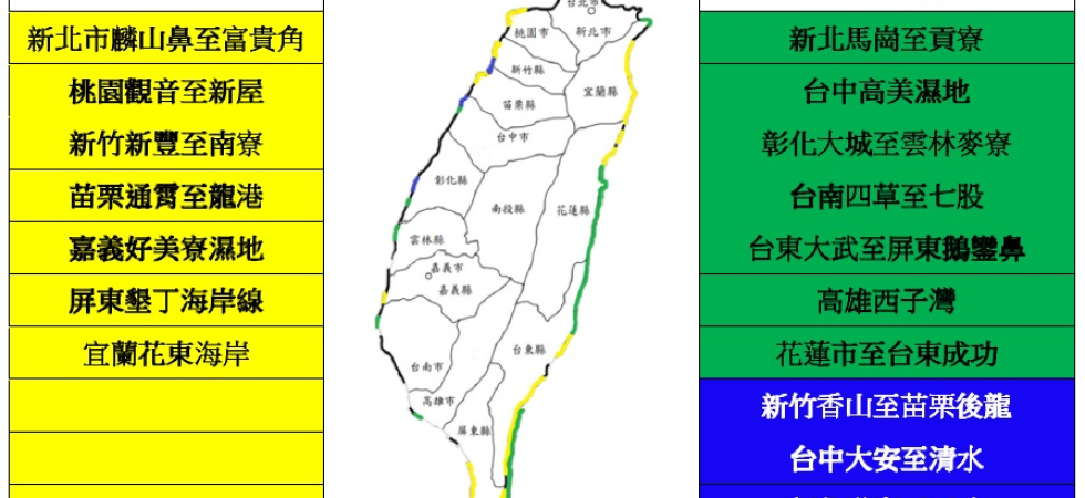 -- 2016/09-2017/07:新北市麟山鼻至富貴角/桃園觀音至新屋/新竹新豐至南寮/苗栗通霄至龍港/嘉義好美寮濕地/屏東墾丁海岸線/宜蘭花東海岸