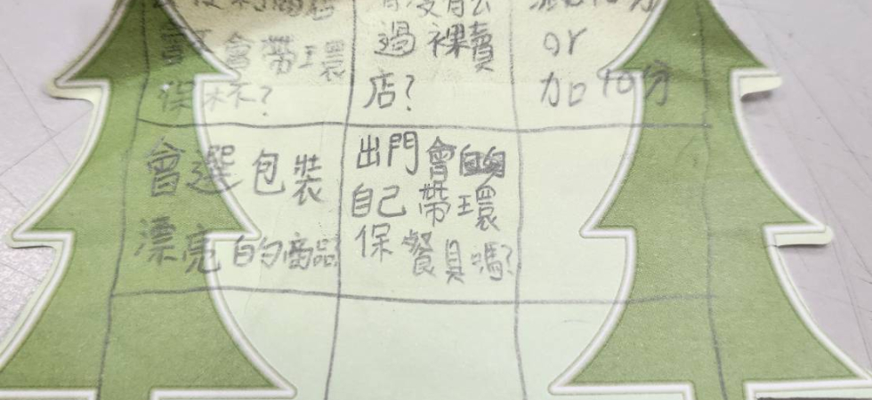 3.環保減塑:環保餐具、環保袋、環保行動賓果,家對環保討論最多,學哥哥分享媽媽環保行動,隨身帶環保杯、環保袋,分享還有環保折扣很划算。