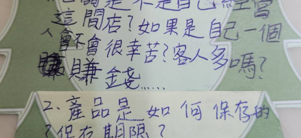 >目的:一開始推廣,大家其實還有些點怕怕的,約訪有減塑觀念的老闆,了解裸裝販賣的難易處與老闆經營的理念, 走入人群前加強小隊的訪問技巧與推廣自信心。
