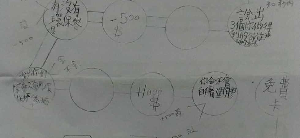 孩子的潛力無限大,進行遊戲初步討論時,原本害羞的小妤秀出他的設計稿,團長一看超有想法,小妤對遊戲設計的熱情也感染了大家,大家紛紛提出對遊戲玩法的建議。分工合作再整合調整,一個看似小孩玩成不了的遊戲設計,一張一張的便利貼,完成了這麼一大張的減塑推廣遊戲。團長決定要將想法化為實體,讓孩子的想法成真,只要敢想接下來努力就對了!( 2023年我們有了新的遊戲,推廣將繼續延續擴大......)