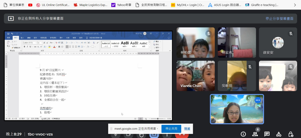 5.(小涔)問是否要作推廣看板呢? → 大家覺得需要,討論後決定使用二手回收的紙箱寫上標語,製作環保減塑看板線上會議討論熱烈,同步團長請大家再想想還有什麼方法可以讓更多人知道我們減塑行動。