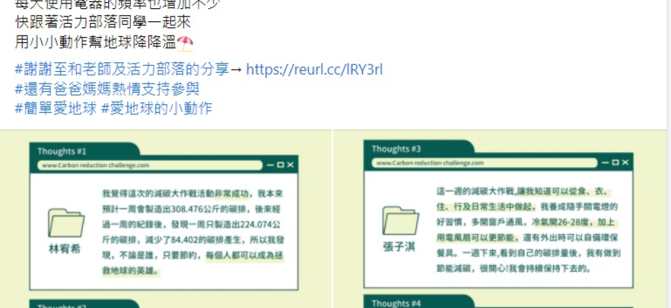 然後我們想到的替代方案是製作碳排放量的記錄卡,因為可以隨時記錄自己在日常生活當中產生多少碳排放量。最後學校因為疫情停課而採取線上教學,我們想如果可以減少紙張的使用,大家就使用線上記錄的方式,這樣更愛地球唷!