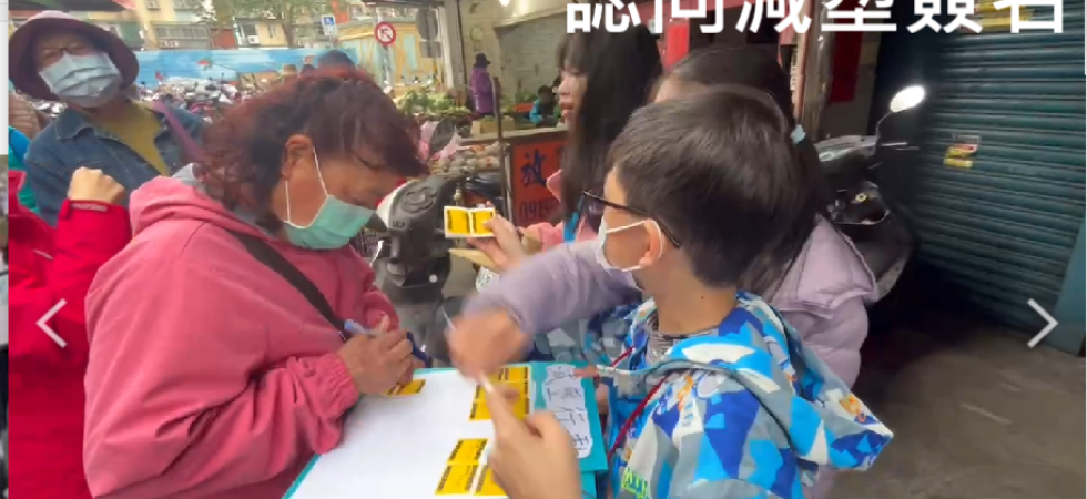 自製減塑看板與認同貼紙,市場阿嬤認同我們就請她簽名畫押,減塑大家一起來!