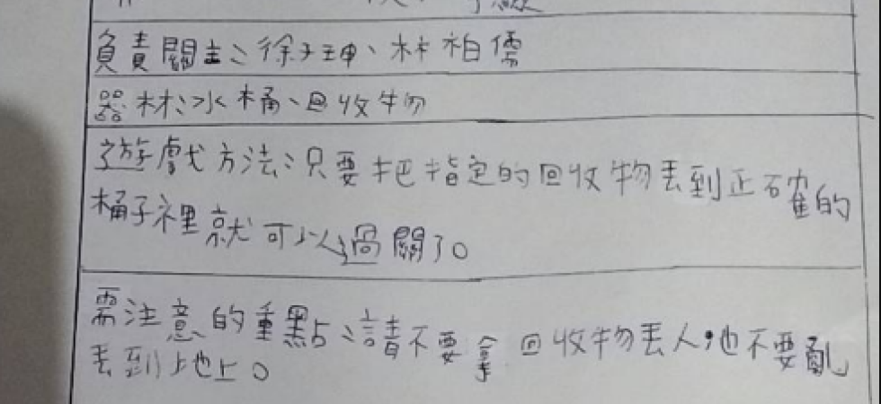 樣還針對顧客使用需求設計。完成後大家先拿到幸福里里長辦公室推廣,里長先鼓勵孩子這麼有心,但是對於孩子製作的回收箱里長提出擔憂: