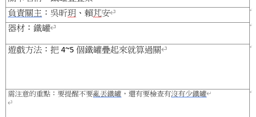2-1設計「關卡遊戲卡」,簡述遊戲方法並寫出如何用1-2句話解說,並特別標出可能發生的問題與預防注意事項。