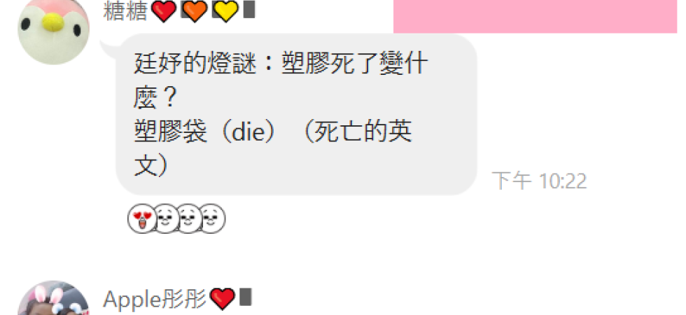*廷妤:塑膠死了便什麼? 答:塑膠袋(die)。