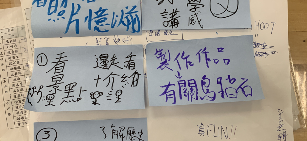 我們都認為「導覽」是最直接有效的方式,但無趣的導覽只會讓人想睡。但是導覽可以有什麼樣有趣的組合呢?大家天馬行空地用便條紙提出各種想法,或許可以騎腳踏車去認識漁村、或許可以帶大家做一些文學活動,更多人提出「遊戲」想法。