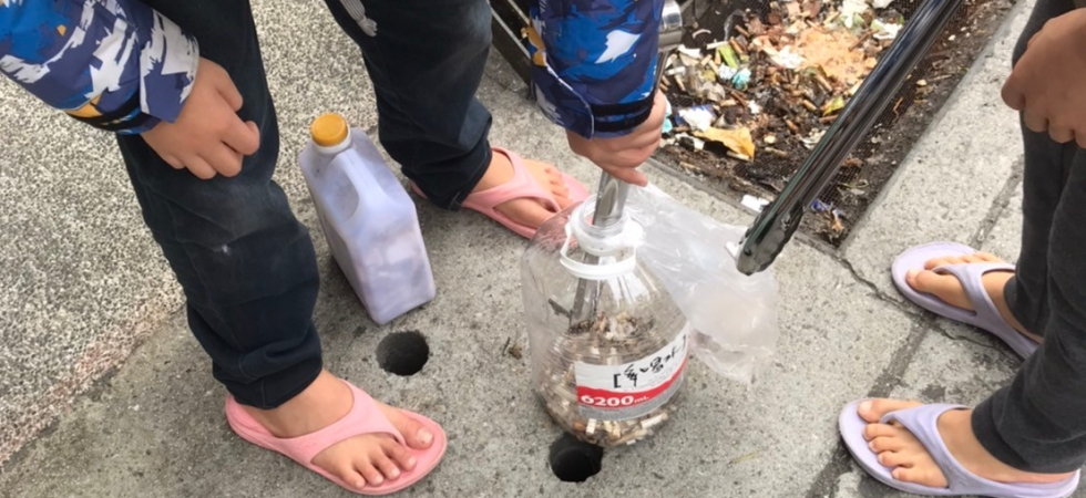 從個人居家菸蒂熱點到駐隊行動,撿拾菸蒂,並與里長合作設置水溝攔截網,定期清理盤點菸蒂數量。