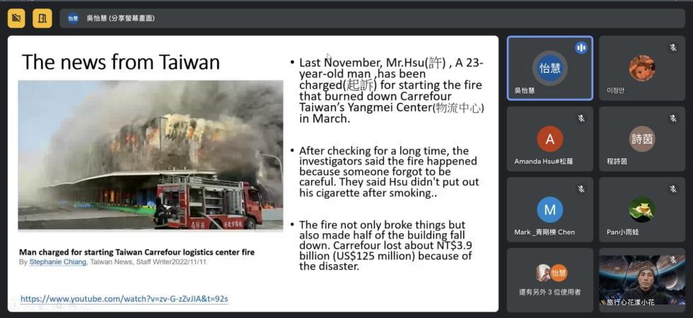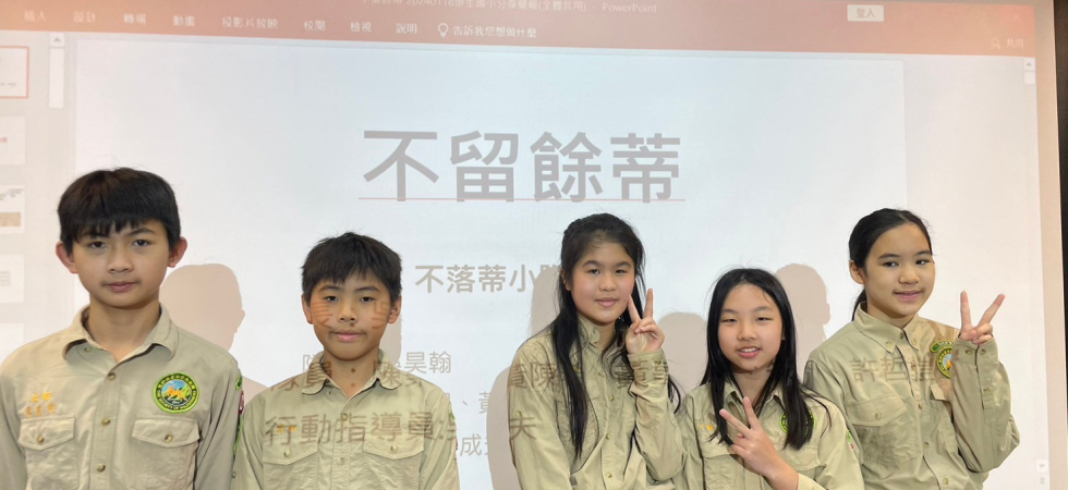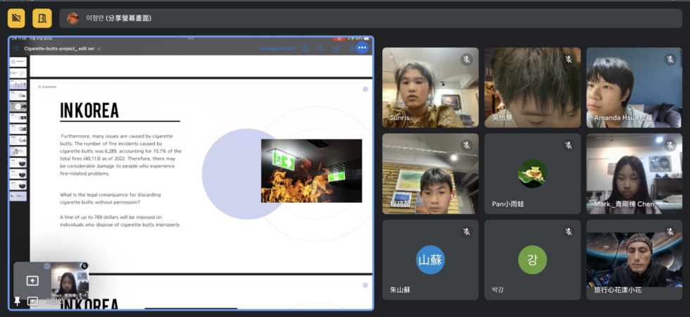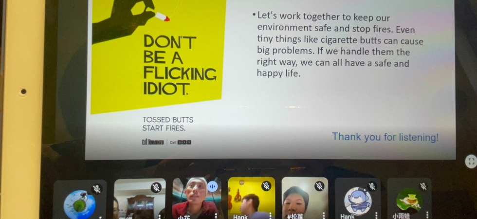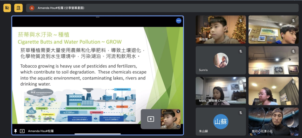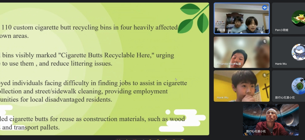 喚起孩子世界公民的責任感與自信心,已經與韓國、加拿大的六年級兒童,以英文簡報進行菸蒂議題的分享,並預計在三月底與美國兒童交流。從中體會在國際舞台上,透過團體凝聚力,共同發展,也是能夠以自己程度的英文,進行跨國交流,並分享對菸蒂議題的看法與行動。