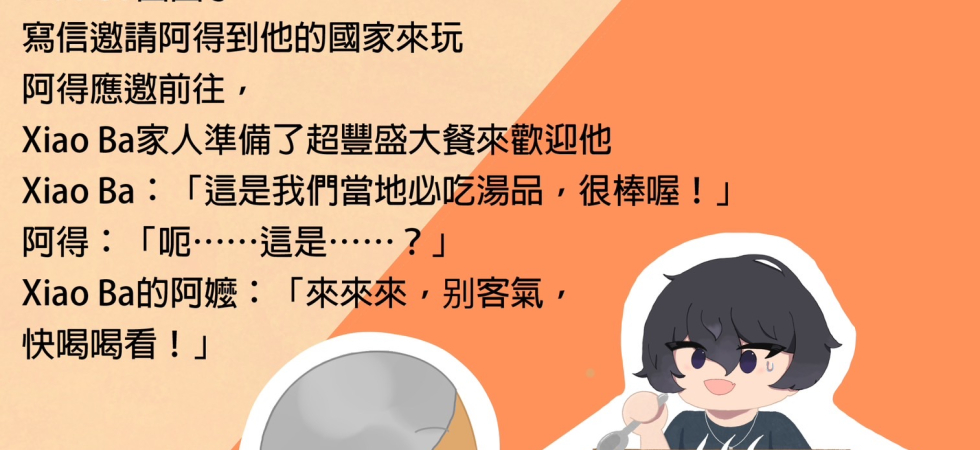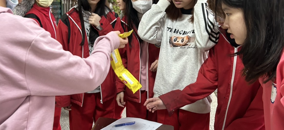 為了讓文化平等的理念更具體,我們決定設計桌遊,捨棄繁複規則,改以「解謎包」形式,讓玩家透過角色故事理解飲食文化。故事主角阿德與Xiao Ba原本對彼此傳統美食感到恐懼,但經過理解後勇於嘗試,展現文化尊重。我們邀請遊夥有限公司的成寧老師指導,確保遊戲的教育價值。此外,我們還拍攝了試吃影片,挑戰納豆、辣咖哩、雞腳凍與臭豆腐。雖然過程中NG不少,但也讓我們更深刻體會飲食如何促進情感互動。我們將影片於課間播放,並在教室門口設攤,邀請同學試玩解謎包桌遊,透過遊戲輕鬆學習不同文化的飲食特色與背後的意涵。看到同學們燒腦後大喊「世界飲食,文化平等」,讓我們感到無比成就感。