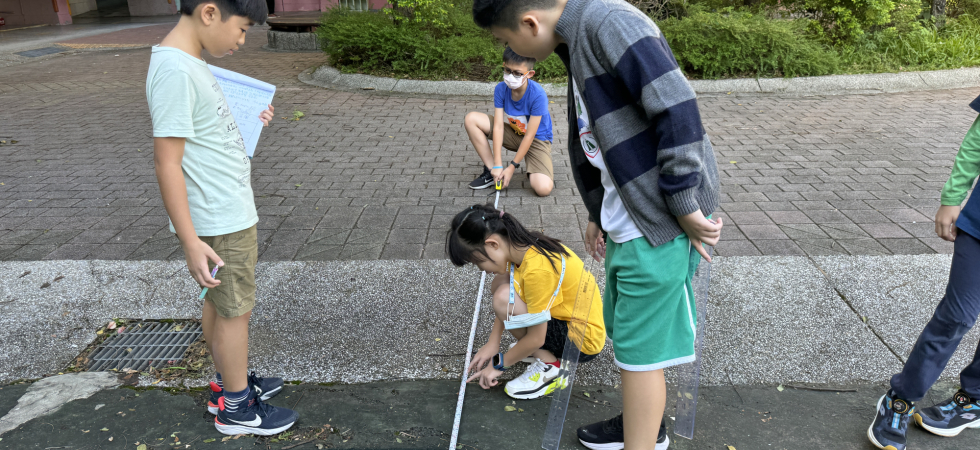 (二) 關卡位置圖設計及丈量,討論可容納的參加人數及動線,我們發現附小校園可遊戲的地圖繪製及空間規劃,經丈量後共有427平方公尺,而每4平方公尺可容納1人,因此學校計算完畢共有四個場地可以玩。