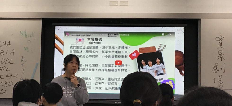 1.教師教學與行政組-老師透過主題式教學,進行議題融入。公民老師進行「節慶與減碳大作戰」;藝術老師進行「實景劇場」減碳新典範;生化專題老師帶領同學透過「科學探究與實作」,進行減碳宣導科學海報、科學影片拍攝的準備。行政團隊則帶領學生進行節慶減碳活動「綠色聖誕」籌備與推動。