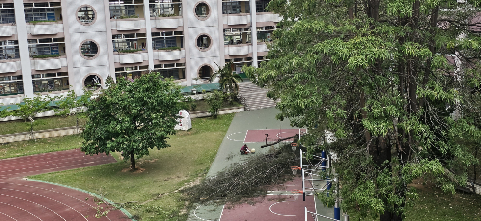 我們學校位在臺中市的重劃區,在進行家鄉走讀時發現重劃區內有受保護老樹,因為新建大樓或道路而被移植及復育(手指向簡報檔),大家非常關心樹木保存與經濟建設開發的議題。這是我們第一個探討實作主題的動機。其次,在學校大門口有一棵老榕樹(手指向簡報檔),之前學長、學姐向臺中市農業局成功提報被列入受保護樹木,看到他們的具體成果成為我們第二個探究的動機。然後,在2024年4月突然刮起一陣強風,導致校內一棵高大的木麻黃突然倒塌,這一棵從小學一年級入學就陪伴著我們成長的大樹,難道就隨著它的傾倒而消逝了嗎?這是我們探討環境實作主題的第三個動機。