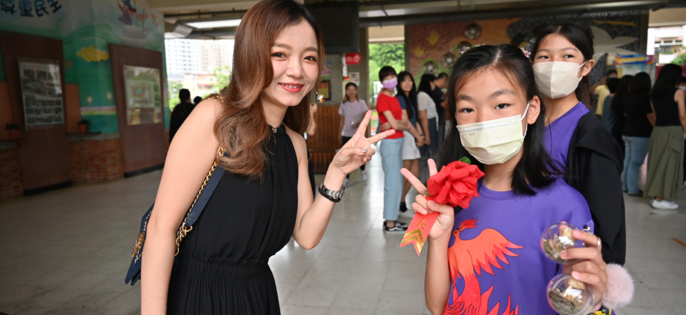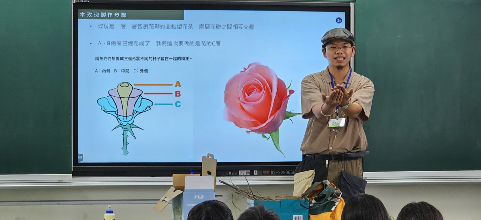 最後將傾倒的木麻黃樹幹為原材料,讓六年級9個班級的畢業生親手製作屬於自己的木玫瑰畢業禮物,實踐「資源循環零廢棄」的理念。