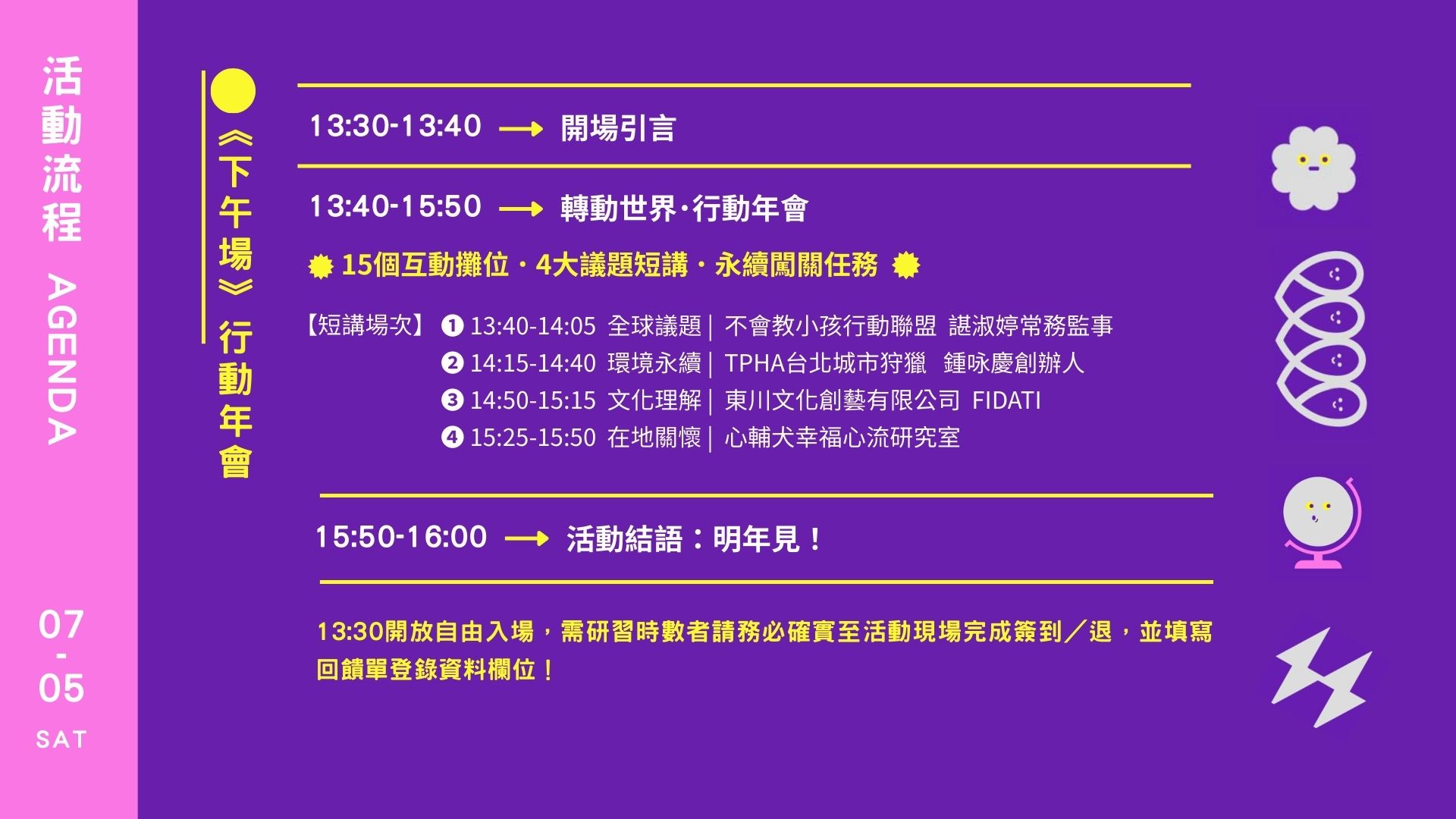 - 下午場-13:30~16:00,13:30開放自由入場