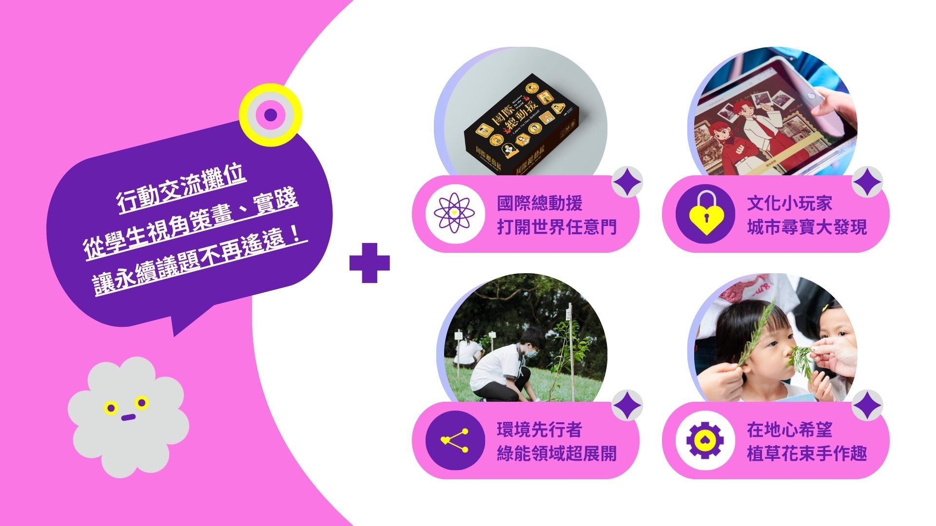 這次年會除了由學生團隊策畫的行動交流攤位,更特別規劃四大議題體驗活動,帶你透過最好玩的遊戲互動、議題體驗,穿梭全球議題、文化理解、環境永續及在地關懷等多元議題,重新找到你沒想到的答案!