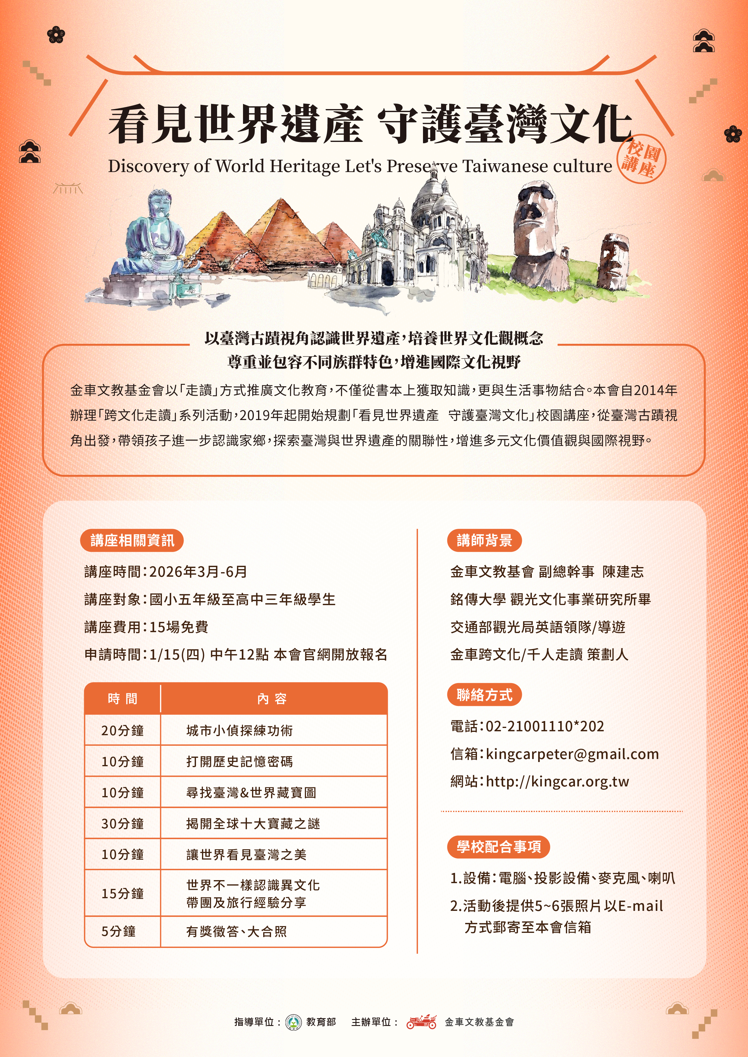 2026「看見世界遺產 守護臺灣文化」校園走讀講座