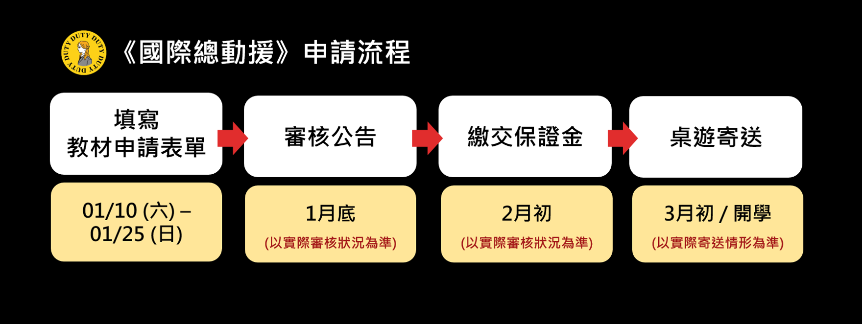 - 申請對象:參加本會 2026年1月《國際總動援》議題式桌遊工作坊 之教師,以學校為單位進行申請