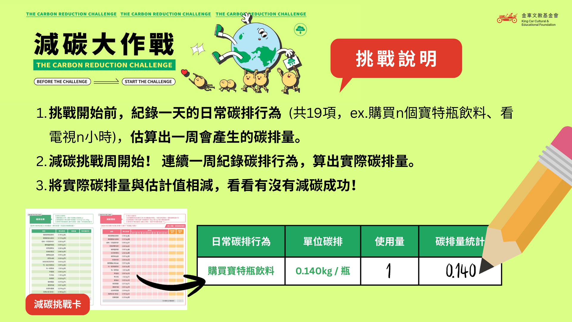 參與方式:每位參與者搭配「減碳挑戰卡」,連續7天執行節能減碳行動紀錄後,由活動帶領人協助彙整總減碳量