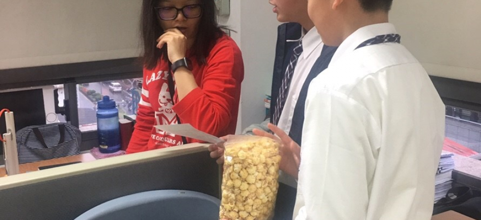 在義賣前一週利用午休時間入班向導師說明義賣的目的、張貼宣傳文宣。並統計預購的爆米花數量。