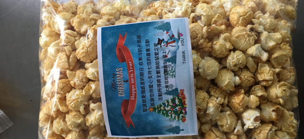 當我利用午休的時間進行爆米花的包裝時,我覺得看到每一張張貼在爆米花上面的標語時,我就多一分的感動也多一分的