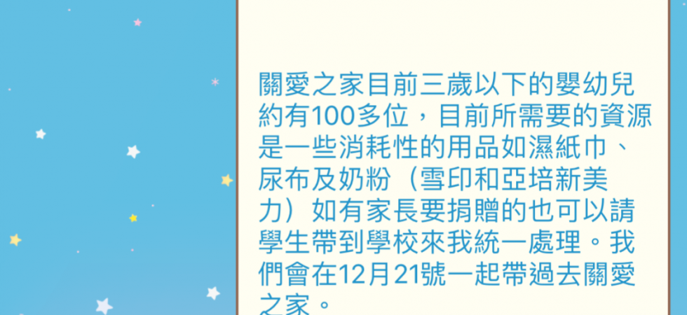 關愛之家因為照顧無國籍寶寶及外籍移工媽媽而成為他們暫時的避風港,然而也因為如此,越來越多的移工媽媽會前往尋求庇護,而關愛之家每年花在醫療、生活必需品方面的費用亦相對提高。我們將藉由班級活動進行義賣,將所得捐助該機構。
