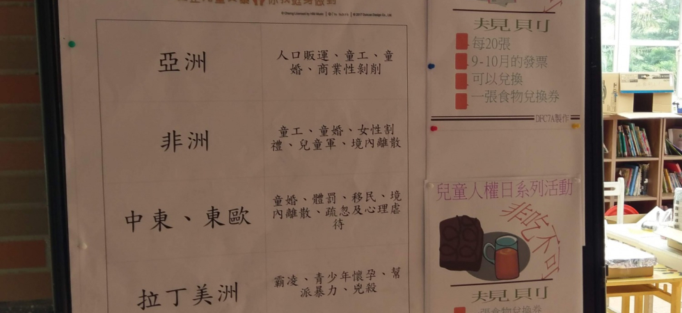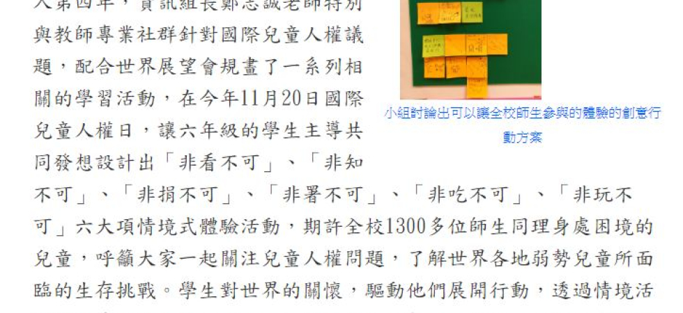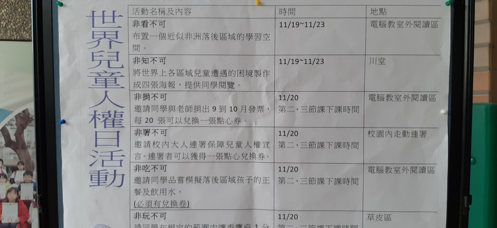 同學在老師的引導之下,發想出6個關於飢餓與兒童人權的體驗活動,分別是:非看不可、非知不可、非吃不可、非捐不可、非署不可、非玩不可。
