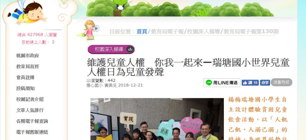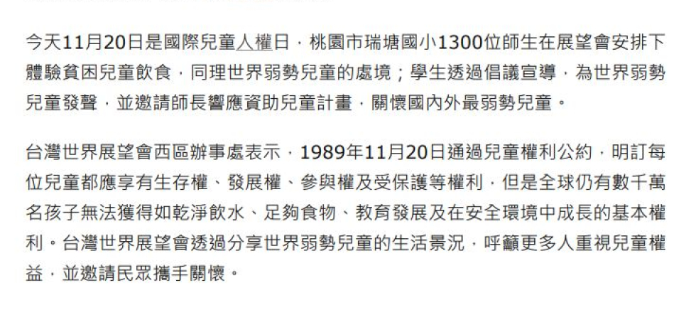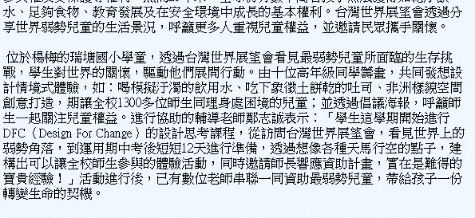 同學邀請了世界展望會桃園分會的志工到校接受訪問,並在一個小時的訪問過程中了解到關於兒童的人權維護在台灣並不是很多人重視,因此,在訪問後決定要利用期中考後不到一週的準備時間,設計一個全校型的體驗活動,目的在讓瑞塘國小的師生都可對於兒童人權問題可以有更多關注。