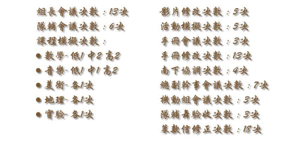 (1)針對營前的需要,我們雖分為四大組,美生組、活動組、課程組、公宣組,但各組的組內工作量不均衡,這一點可以再調整。