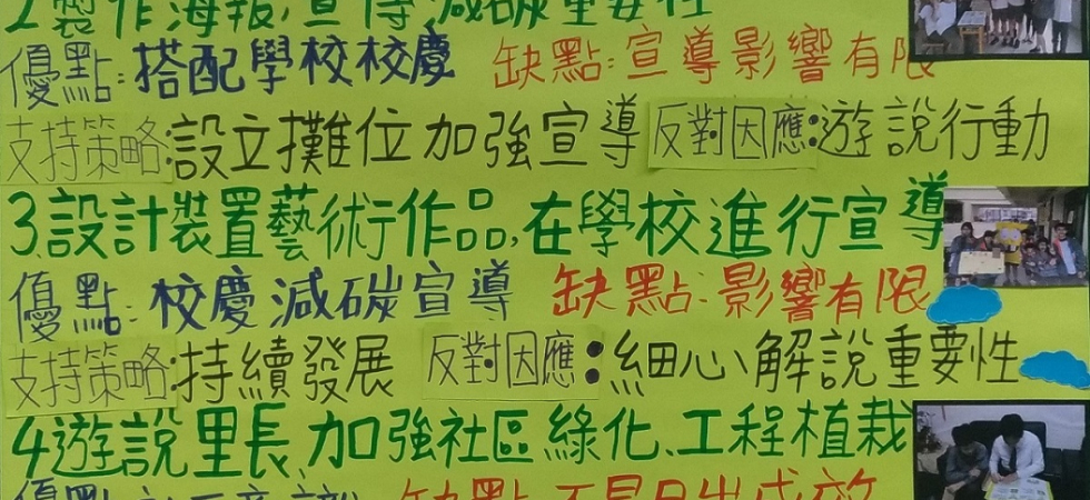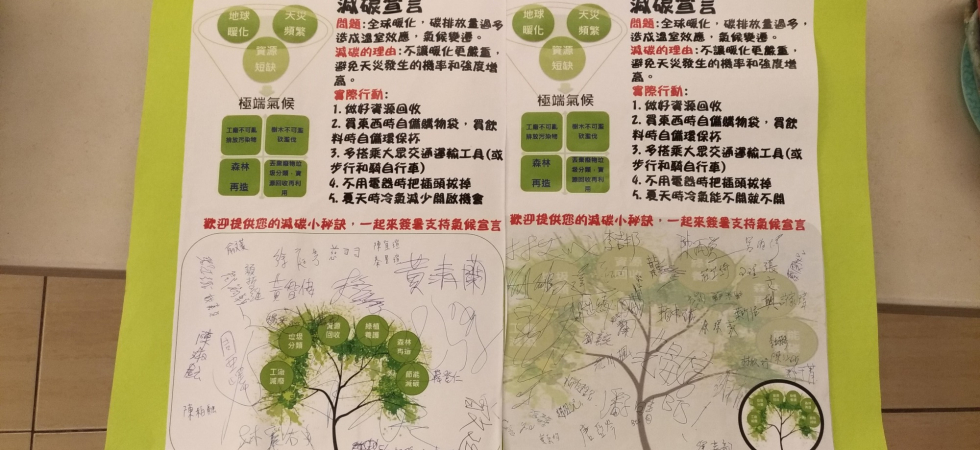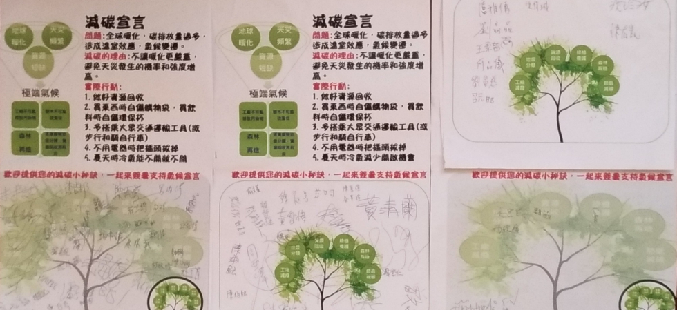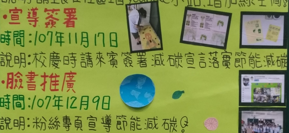 說明:我們在校慶時,向師生與來賓宣導節能減碳的重要性,並且請大家在減碳宣言中簽名,支持我們在生活中落實節能減碳的行動並且一起努力實踐!獲得校長與家長會長的支持與簽署。