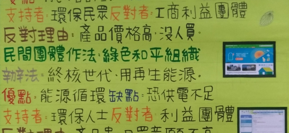 巧欣:在這次的討論我學習到了很多也有了很多經驗 例如跟同學一起合作還有做出一些PTT 做出了海報還有跟大家宣傳 也發表了自己的感想提出了很多問題也解決很多問題 雖然在討論的過程中有很多爭吵有很多意見不同但我們都一一解決也有了共識 因為這些許多的問題讓我們有了好奇心想要解決也訪問過很多人問過很多意見我們最終的目標是讓一些的地方有所改變 最好最好的是讓世界變得不一樣 有很多人幫助我們提出很多的問題也幫助我們解決我們很謝謝他們提供我們意見讓我們更好處理這些問題