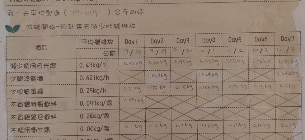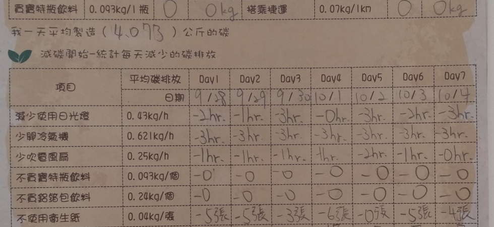 說明:我們領先做出了減碳計畫,於一個禮拜減少了高達913公斤碳排放量漂亮的交出了完完美美的成績單。