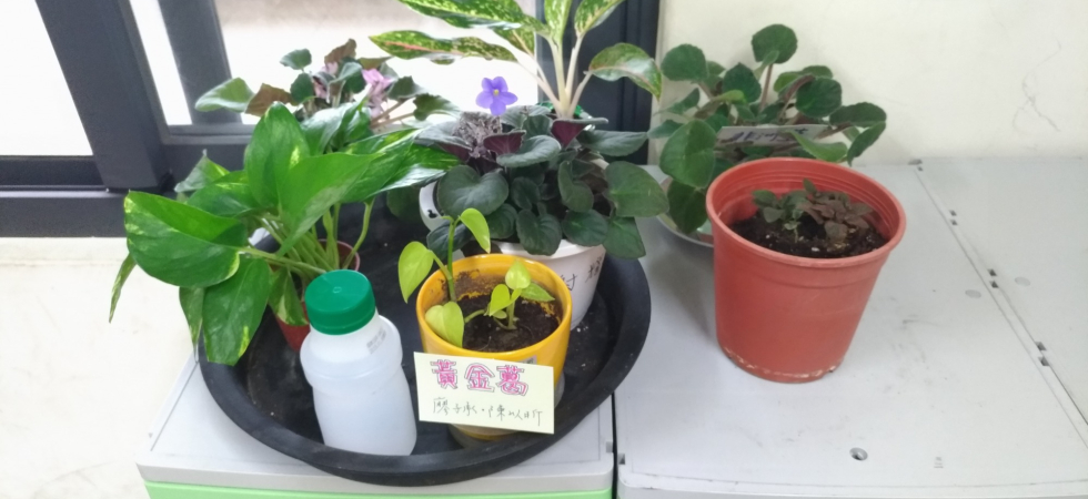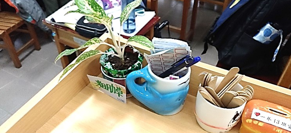 說明:我們在教室的一隅擺放幾盆盆栽,除了能捕捉二氧化碳帶來些微的減碳效果外,感覺在教室裡更增添一種樸實的綠藝,也讓教室風景有了不一樣的風采,原來生活美學無處不在。