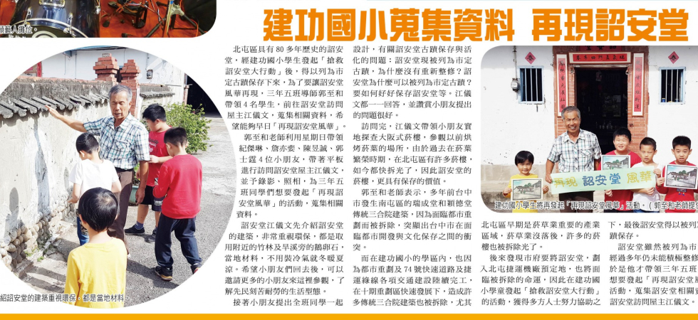 看到建功國小的學長、學姐曾經努力搶救可能面臨被拆除的詔安堂,後來很順利被列為市定古蹟,學長、學姐搶救詔安堂的故事還以漫畫的方式刊登在國語日報,我們才發現在生活周遭有一座這樣值得保存的古蹟。