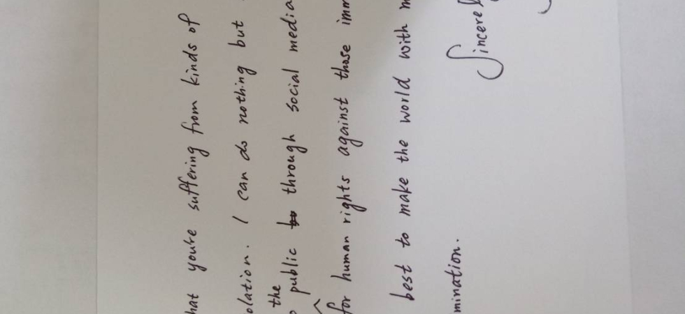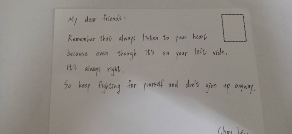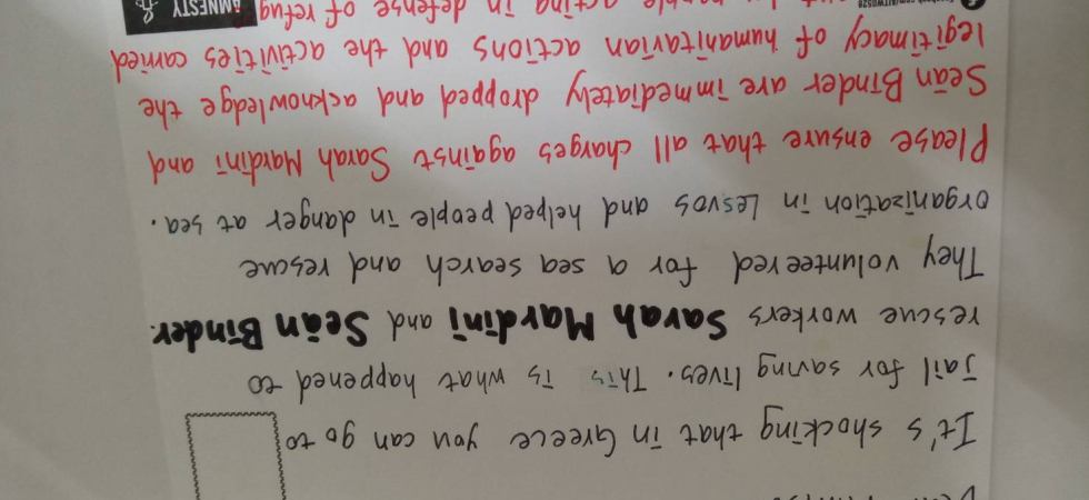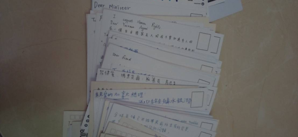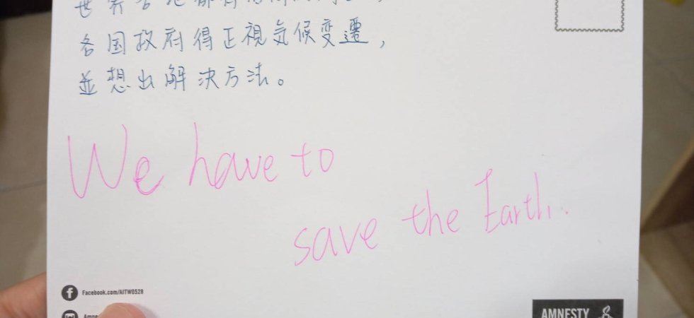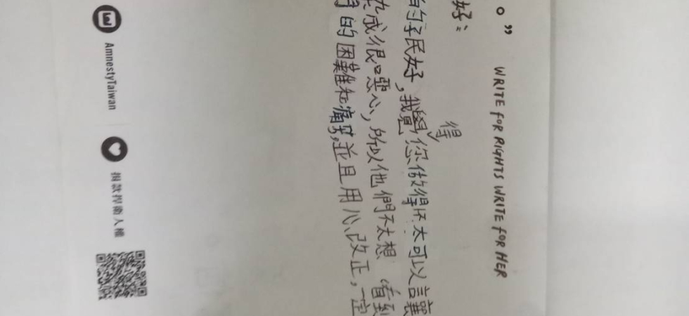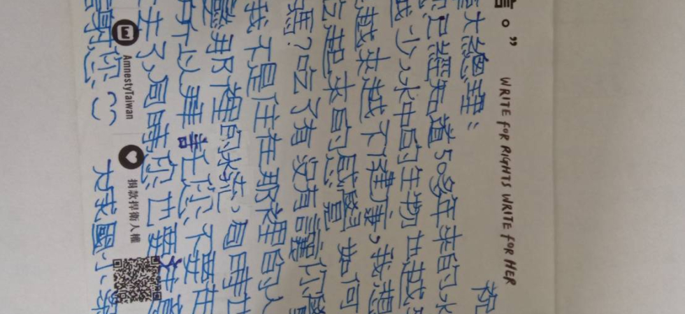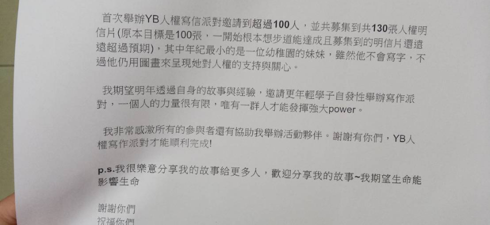 在一次演講中,講師分享國際特赦組織致力於推動人權的訊息。會後我立即查詢這方面的資料,得知在每年年底固定舉辦「寫信馬拉松」的活動,因著之前亞洲女孩大使的感動,主動寫計畫書向台灣分會申請,也召集夥伴共同策劃。