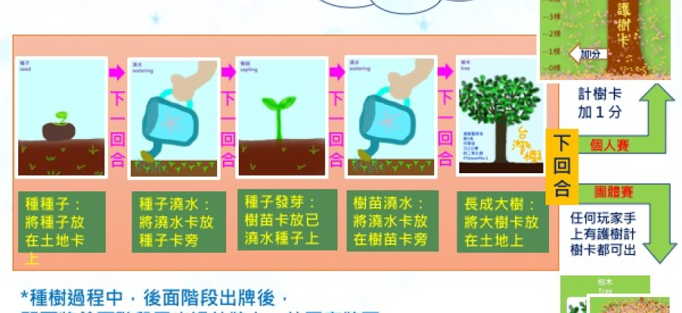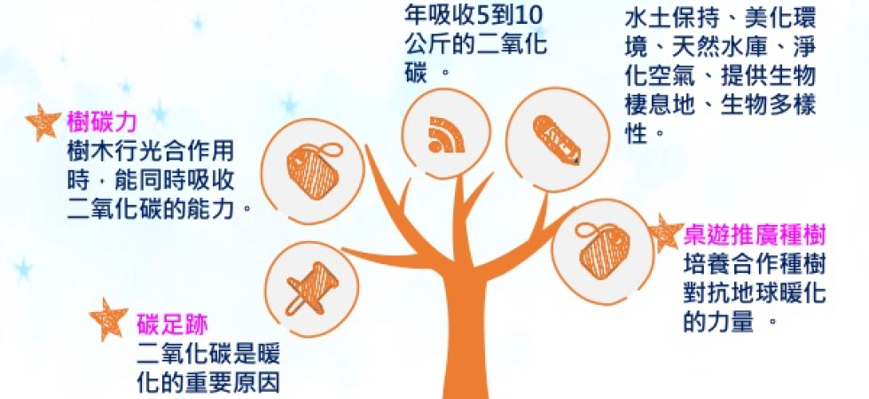 我們發現同學喜歡玩桌遊,我們也都喜歡玩桌遊,因此我們決定以種樹為主題,用玩桌遊的方式推廣種樹活動,希望同學們能在遊戲過程中了解植樹人的辛苦,並學習到不同樹種的吸碳超能力,透過玩桌遊培養合作種樹對抗地球暖化的力量,希望大家一起種樹愛護地球。