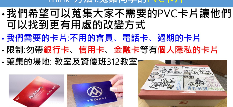 讓大家知道PVC汙染全我們希望透過入班宣導來蒐集PVC卡片,球的嚴重性後,再請同學們將家裡不需要的PVC卡投進我們製作的「PVC卡片回收箱」。雖然不一定能改變大家「期限一到,就丟」的想法,但至少透過我們的行動,並且多次提醒之後,相信就能讓很多人記起這件事,並實際去做出環保愛地球的行動。