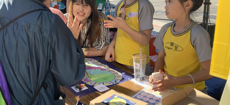從校內的宣傳一直到走出校園外去北投捷運站擺攤,孩子們義賣自行設計的桌遊,並且將義賣盈餘捐贈給老五老基金會-北投老人日照中心。