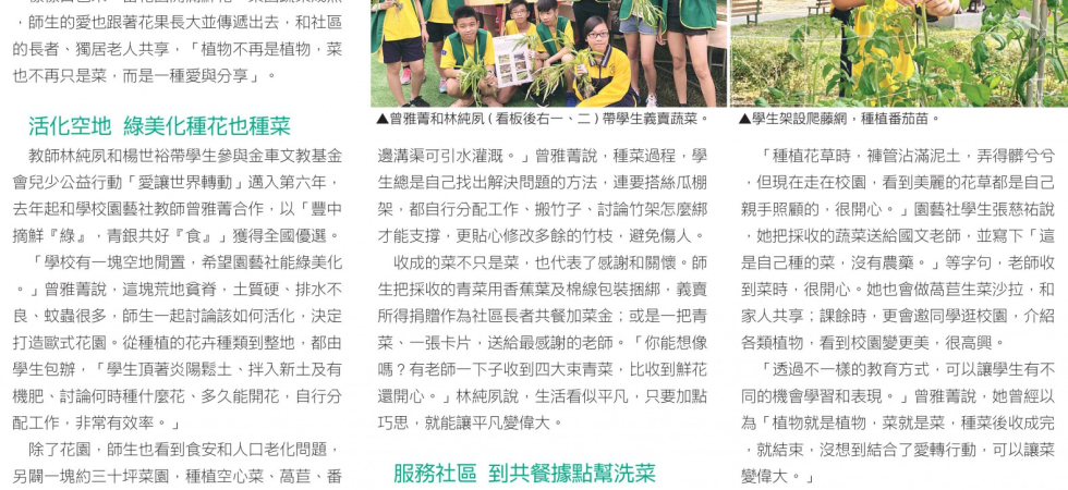 『豐』柱決定種植季節蔬菜,搭配對老人有益的蔬菜,校園中充滿各式各樣新鮮蔬菜,不用擔心農藥殘留。採收後送給身邊的人,義賣收入當老人加菜金。