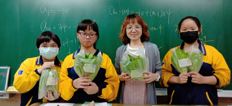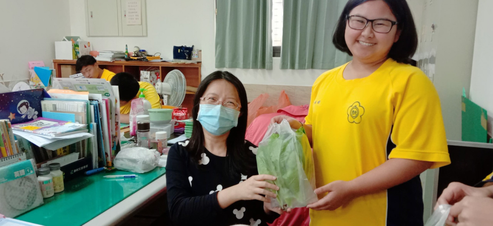 自採蔬菜包裝加上手寫卡片,老師的笑容像太陽一樣燦爛奪目,拋開憂鬱的心情,展現年輕活力快樂的心。