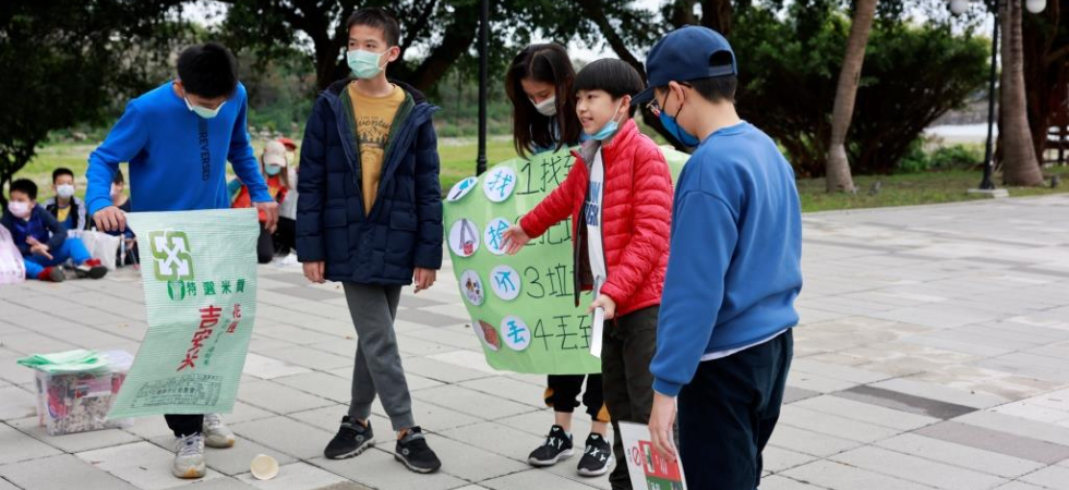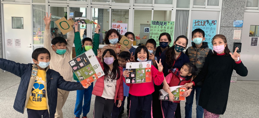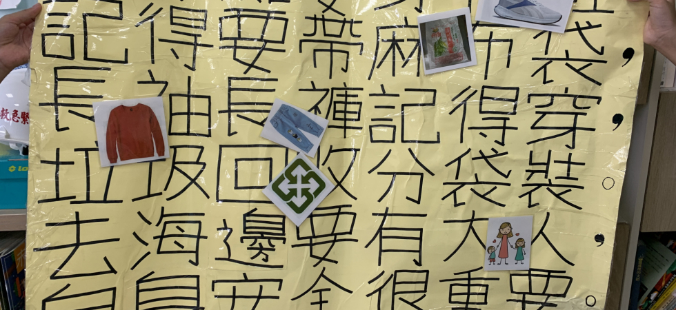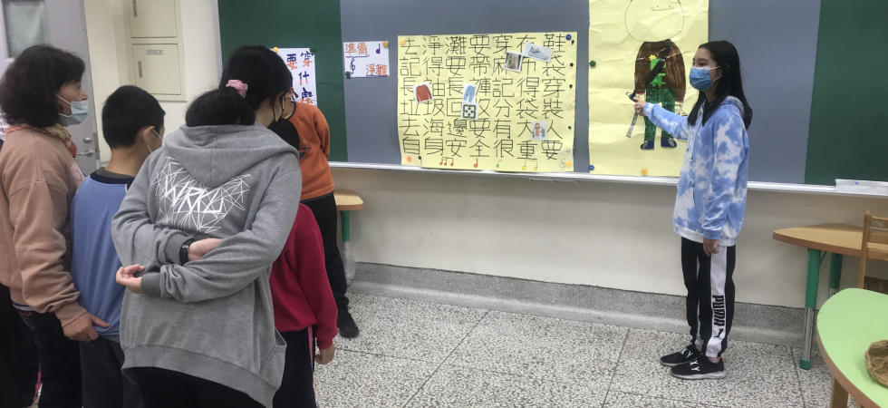 「海洋是什麼」組別配合口訣跟手勢動作去幫助小朋友記憶,哪些是可以從事的海洋動作,並且用圖卡做判斷,這個活動是海洋還是陸地活動。「淨灘的穿著」組別,是用小星星兒歌曲調,搭上自製的淨灘穿著歌詞,讓小朋友可以用唱歌的方式記住淨灘的裝扮,並且用一張卡通人物圖再次強調,接著用實際的衣服、鞋子等去做拿取確認。「垃圾分類」組別,把常見的海灘垃圾做三大分類,分別是一般垃圾、回收垃圾跟危險垃圾,並做成分類圖表。小朋友可以透過比對圖表,用圈叉牌回應垃圾類別外,也透過實際撿拾跟丟到相對應的麻布袋中完成任務。