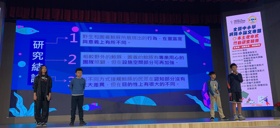 我們從三年級開始就在課程中接觸了鯨豚相關知識,過程中我們除了經常去賞鯨之外,我們也有道海上解說給客人或是其他學校學生聽。一直到五年級時,我們想要針對相關議題去進行行動探討,但是鯨豚的相關行動議題有很多,例如:誤食擱淺、圈養、友善賞鯨等等,在這些議題當中,我們感受到最直接的問題就是什麼才是對鯨豚最友善的接觸方式?因為在花蓮,同時就具有海洋公園裡有圈養的鯨豚,以及花蓮港外可以透過賞鯨看到許多野生海豚。我們覺得鯨豚被圈養這個問題會迫害鯨豚的生存權利,尤其鯨豚又是保育類動物,為什麼可以被圈養又能被強迫表演?所以我們覺得應該要更深入地去了解問題點,才能讓更多人選擇以正確的方式去接觸鯨豚?我們想像所有被圈養的鯨豚都應該要回到大海裡,自由快樂的生活,而不是只有被關在一個小小的水泥池子裡,為了迎合人類的快樂需求而被迫做出違反自然的行為,造成牠們的身心壓迫。我們也希望,可以讓更多人知道動物權利的重要性,在消費的同時也要知道自己的消費其實決定了其他生物的生存方式。