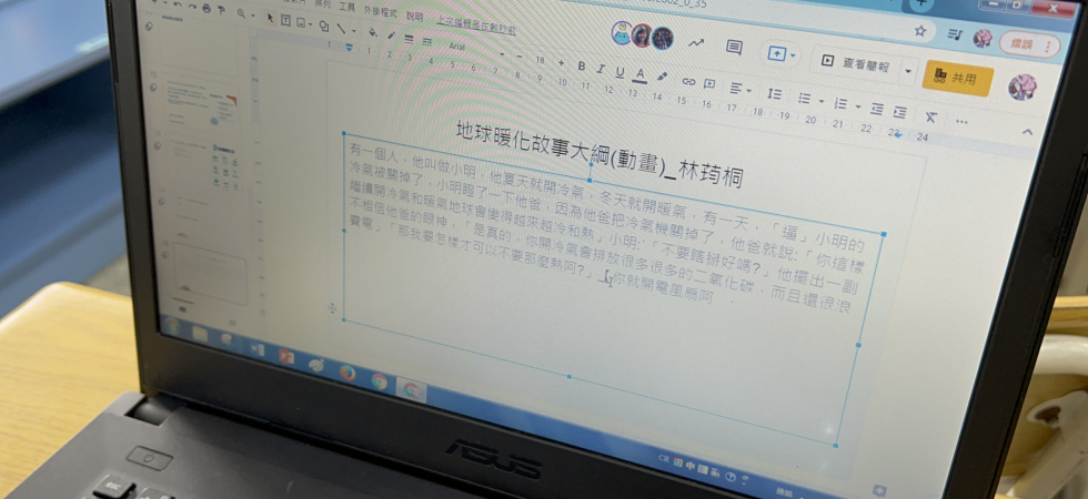 林生:我們組決定的主題是地球暖化,因為,讓你想想,你可以做一個很簡單的舉動,而且也可以拯救地球,你一定會想要吧,但是真的會有人做到這個簡單卻很有用的環保舉動嗎?因為這件事,所以我才會選擇這個主題。我在這個團隊裡負責的項目是做環保小動畫,讓同學在歡笑的時間也可以學到有用的能源知識。在製作動畫的時候,我有遇到一個讓我很懊惱的事情,那件事是我在配字幕的時候,字幕和角色說話的時間一直對不上,我解決的方法是使用那個動畫軟體自帶的計時器,來解決這個「難纏」的問題。我在團隊合作的時間有沒有學到東西呢?當然有啦!我在團隊合作時學會了如何教導別人,讓團隊可以做得更好,我也學到了很多很有用的環保知識,並且做到了這些「簡單」的舉動,讓我很開心。如果可以,我很希望在下學期的時候可以入班,甚至是進入別的學校來宣導,讓更多的人可以重視這個議題,讓這個世界多了一個「明天」,讓這個世界可以多了一絲絲希望。我最想要感謝的人就是所有有做出環保舉動的人,不管他做的環保舉動是很顯眼,還是不顯眼,我都很感謝他們,因為,他們改變了這個台灣的命運,也因為,他們改變了這個地球的命運。