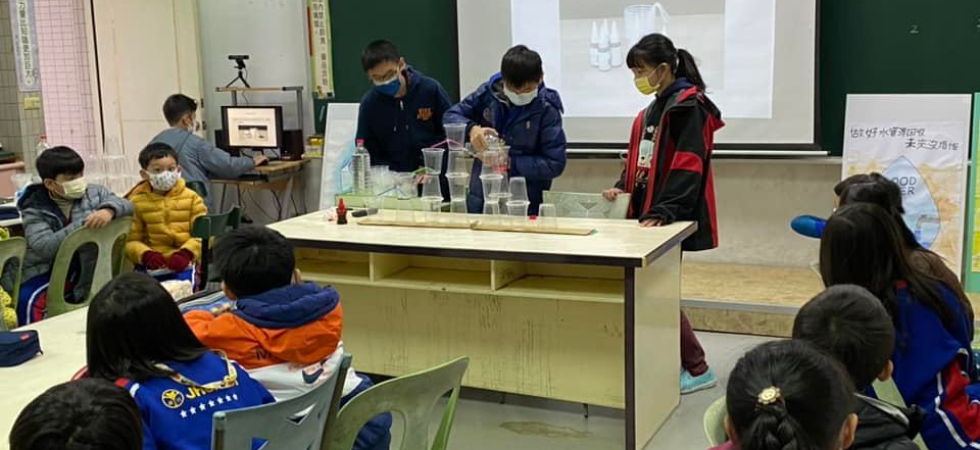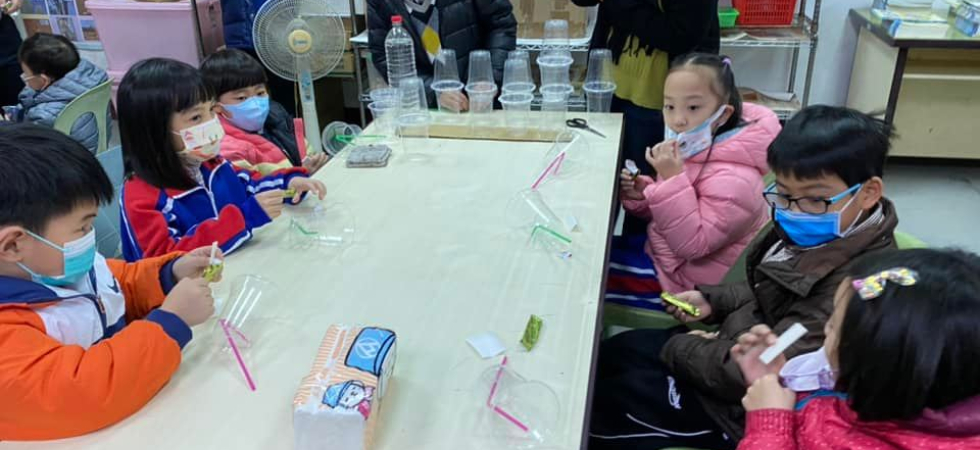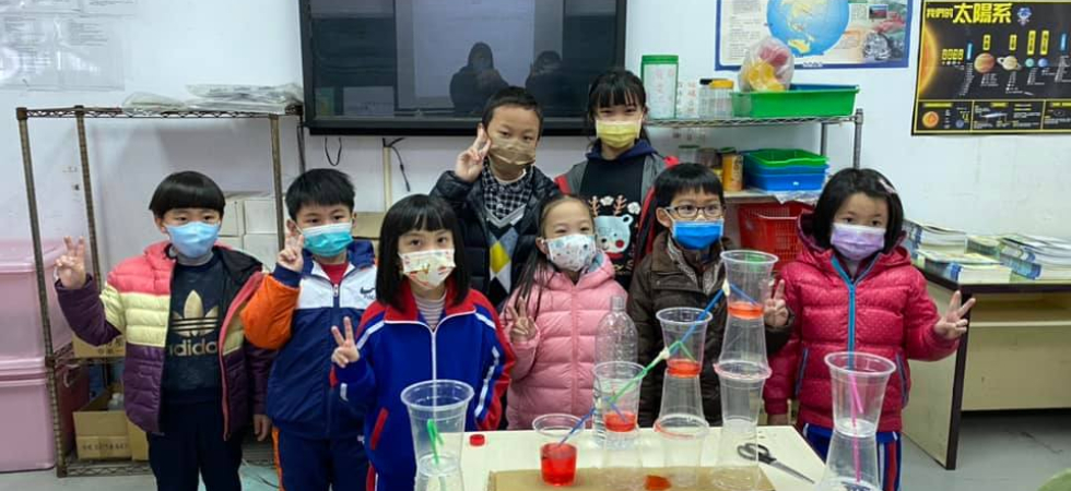 5.水汙染改善的科學實驗:教導一年丙班的學生,告訴九龍公道杯的製作方式,廁所馬桶的設計就是採用這個方式,才能避免難聞的空氣與味道,像是斗六汙水處理場也有類似的設計,目的降低汙水的臭味,希望小朋友們繼續努力來愛護我們的地球環境。