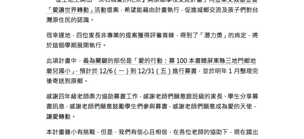 因此,提出期望透過都會區國小為原鄉學校的募書行動,以充實偏鄉學校的閱讀資源,賦權原住民學童。
