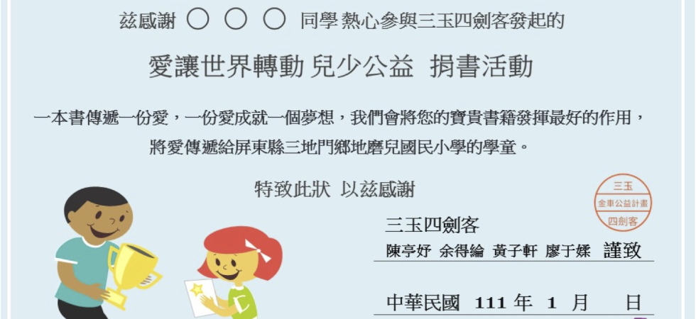 5. 指導老師設計並製作贈書感謝狀(附件九),由三玉四劍客至各班級一一親送給贈書師生表達感謝。