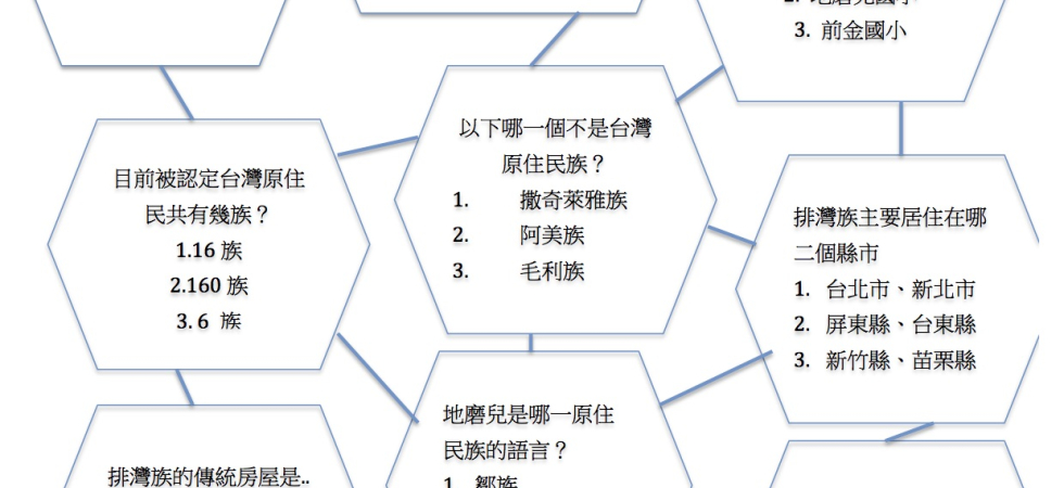 1. 指導教師分別設計兩款以台灣原住民、排灣族及地磨兒國小為主題的學習單。「完整版學習單」(附件一)請三玉四劍客運用網路或圖書館資源完成系列題目,「簡單版學習單」(附件二)請406班全體學生於班級簡報後填寫,以強化記憶。