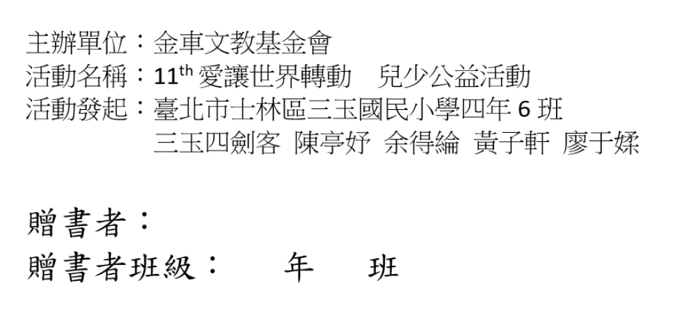 3. 指導老師設計並製作募書宣傳單(附件五)、贈書憑證(附件六),撰寫募書行動給老師的一封信(附件七)、給家長的一封信(附件八)等,以E化及書面方式說明募書行動及進行宣傳。